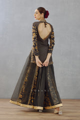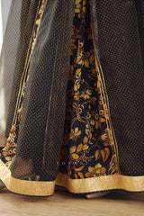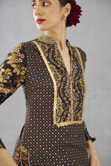 This Gulghast Mehza Sharara Set lends a timelessly gorgeous look for special occasions. Crafted from jet black Bhagalpuri printed slub silk, it comes with a kurta featuring double layered sharara and sheer silk organza odhni. Detailing of gota embroidery and hand adda work with gota complete the look.