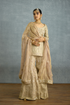 Crafted in richly embroidered tissue, this beigish-gold sharara set features a fitted kurta adorned with intricate heirloom motifs and a voluminous fit-and-flare gharara layered in panelled embroidery. Regal in tone and timeless in craft, the ensemble embodies Malka’s quiet opulence and ceremonial elegance.