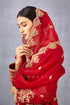 The Sindoori Pushti Odhni is a traditional red sheer Silk Organza odhni, featuring bright gold Gota embroidery and intricate temple scallop designs. Hand embroidery, Dori embroidery and Hand Adda work create a timeless look perfect for any special occasion.