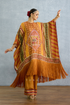 The Kanak Bhamini Kaftan Set is an exquisitely crafted vibrant kaftan set featuring a bright yellow kaftan and a pair of straight pants. The kaftan features motifs inspired by the traditional Patola weave, while the striped straight pants feature a beautiful border. This set is indeed a unique find for this festive season.