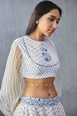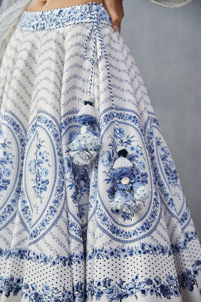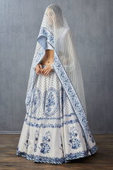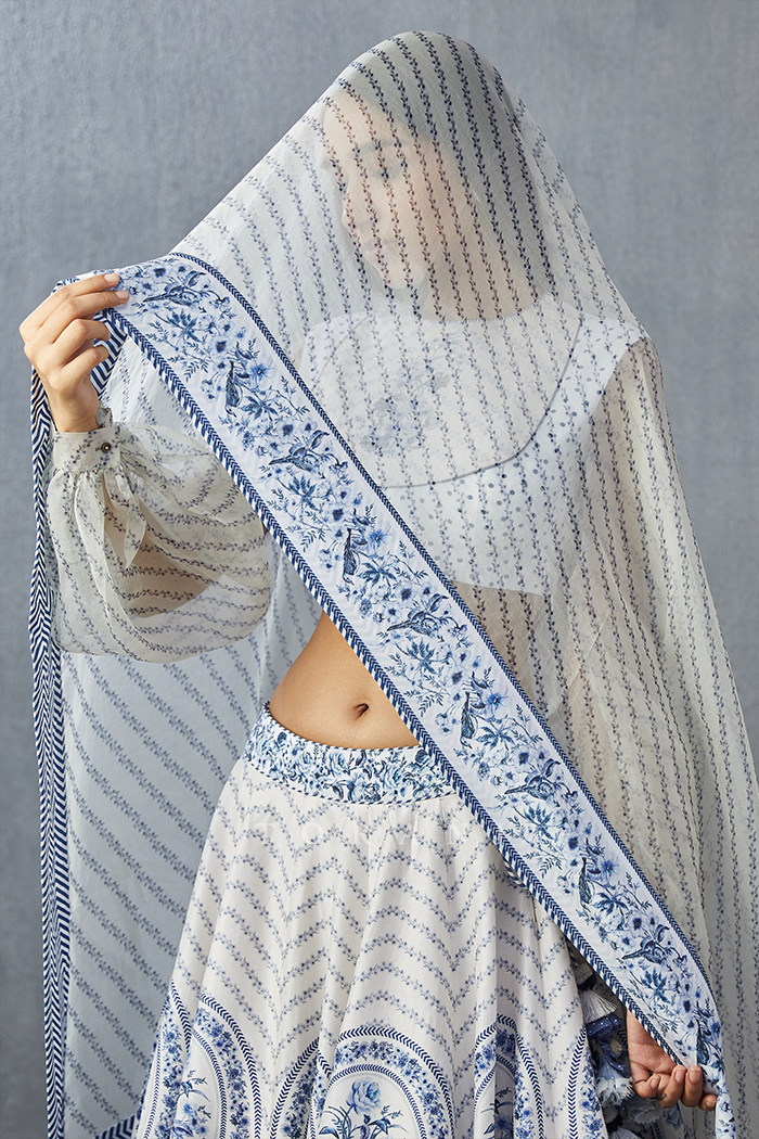 This exquisite Neeli Gauraiya Poulami Lehenga Set is carefully crafted from luxurious fabrics of soft handwoven Chanderi and Cotton Silk, creating an airy and lightweight garment. The set is adorned with beautiful digital print work in a dazzling shade of blue, guaranteeing an ethereal look.