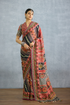The Surkhi Krishnabha Saree is crafted with a luxurious silk fabric, ornated with vibrant bhats or motifs. The saree indeed revives the timeless craft of Patola weaves and features hand sequin work and hand embroidery along with tassel details at the end of the pallu.
