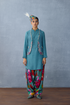 Grace any occasion in this beauty. The Dil Nawaz Minoo Jacket Set is crafted in slub silk and jeni silk fabric in beautiful blue hues. The set features an aqua blue kurta paired with matching salwar and jacket. The gorgeous colour of this set is a bright addition to your closet.