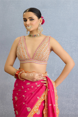 The Padma Vishakha Saree is crafted from georgette in a striking shade of pink. It is intricately embroidered with dori work, rainbow cutdana, and traditional dabka and badla work, along with pearl embellishments.