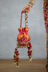 The Rangili Jinal Potli is crafted with a luxurious jeni silk fabric and features beautiful multicoloured motifs inspired by the ancient Patola weave. The potli is further accented with big tassel details.