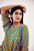 A checkered top in yellow and Lapis blue, styled with raglan sleeves and tie-up detail at the front. It is paired with Anjum Wide-leg Pants for a relaxed yet playful look.