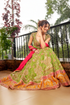 The Zunairah Naureen Anarkali Set is crafted with luxurious shimmer organza and cotton silk fabric in a gorgeous lime green shade, with intricately embroidered classic Indian motifs. The grace of this set originates from the Mughal art-inspired motifs, the orange and pink-toned broad border, and the graceful green and coral pink shade of the anarkali and odhni- making this a truly one-of-a-kind find for your festive moments.