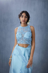 The Aasmani Azara Blouse is made with luxurious organza and adorned with intricate Aari Embroidery. Its blue hue creates a beautiful contrast with the fine detail. Elevate your wardrobe with this timeless and elegant piece.