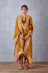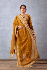 This Aftaabi Makhmal Qurbat Kurta Set is crafted from luxurious silk velvet, cotton voile, and silk organza, and features intricate hand embroidery, dori embroidery, hand adda work, and Gota embroidery. The striking yellow color is enhanced by digital print for an elegant finish.