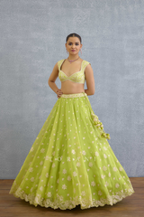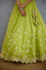 The elegant Angoori Avani Lehenga Set is crafted with a comfortable combination of organza and jeni silk fabric. It features intricate embroidered details with tropical flora motifs. The vibrant green shade of this lehenga offers an unique appeal to your summer events.