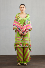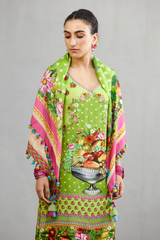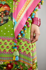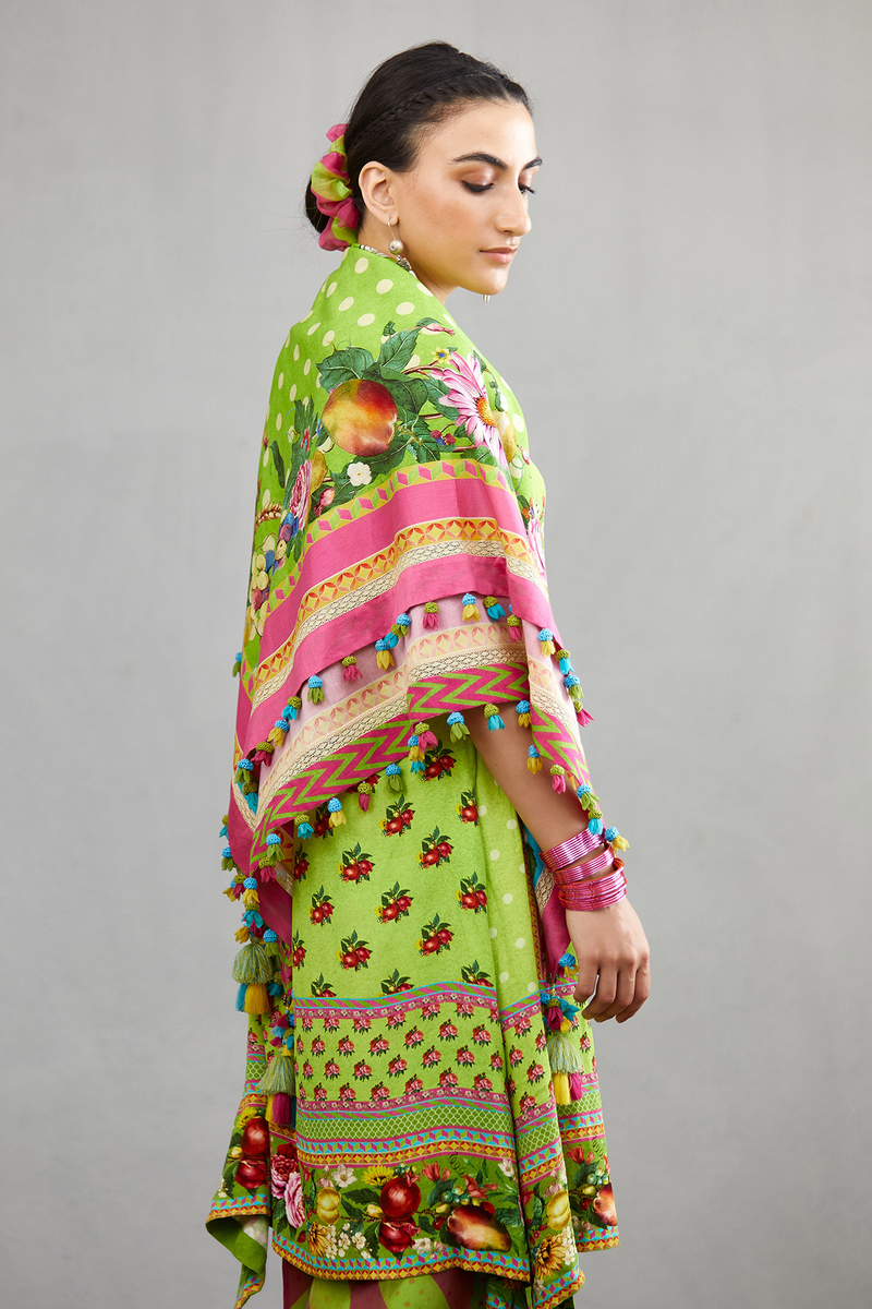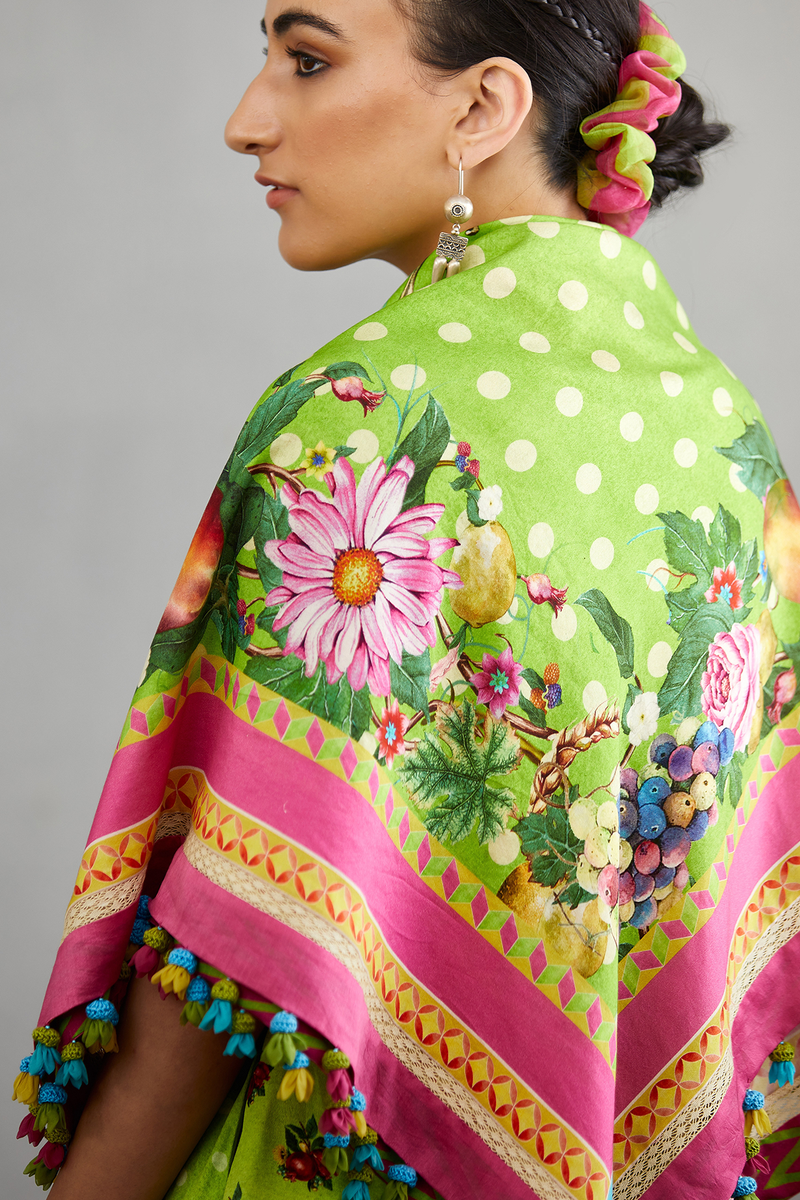 The Angoori Raasleela Scarf is crafted with a gorgeous green-coloured handwoven chanderi fabric and makes it an exquisite find for your wardrobe. The beuatiful fruits and florals printed on the scarf gives it an unique look.