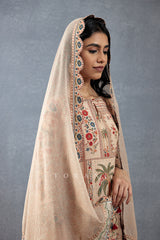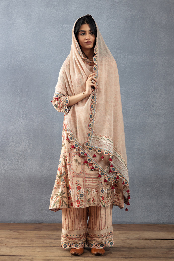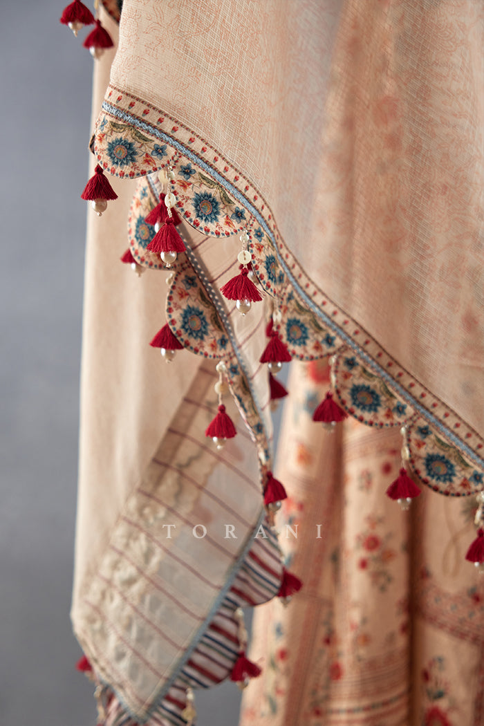 Badami Aroha Odhni by Torani is perfect for special occasions. Crafted from a blend of Cotton Kota, Handwoven Chanderi, and Cotton Silk, this Odhni features a beautiful Digital print and Hand Block print for an exquisite finish. Boasting a neutral beige hue, it's sure to make a statement.