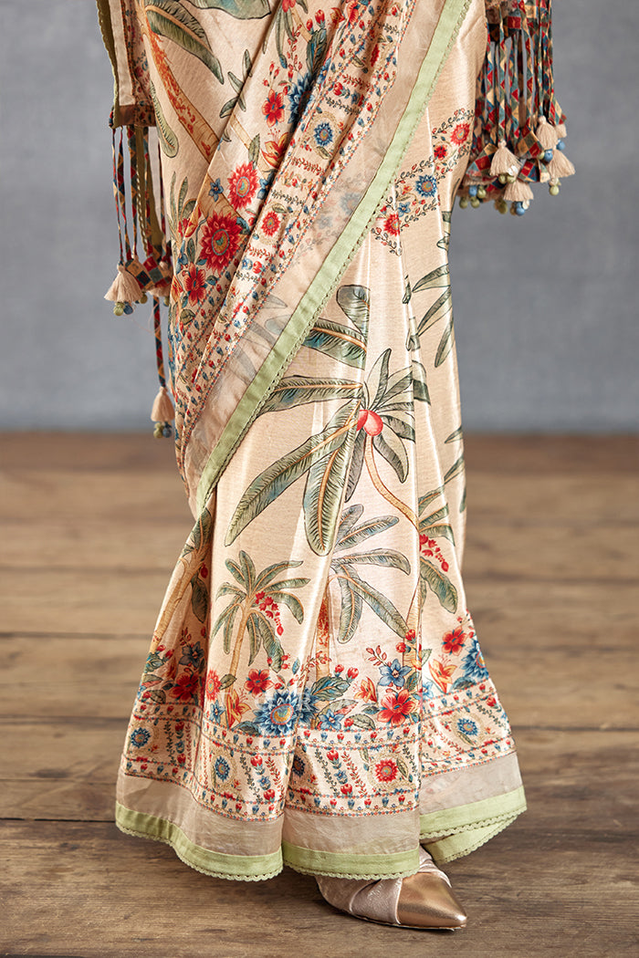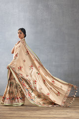 Introducing the Badami Mridhini Saree from Rafu Collection. Handwoven using Chanderi and Cotton Silk, this elegant beige saree features an intricate Digital Placement Print for an elevated look. Expertly crafted for a timeless style.