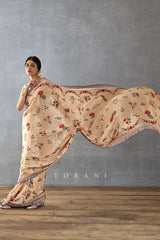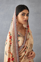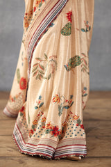 Our exquisite Badami Parnika Saree is handcrafted from the finest Chanderi and Cotton Silk. The exquisite digital placement print gives the saree an elegant and sophisticated look. Its beige hue brings a subtle, yet eye-catching, style to your wardrobe.