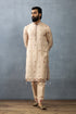 This stylish Badami Prabeer Kurta Set is a must-have for your wardrobe. Crafted from a blend of slub silk, cotton silk, slub cotton, and cotton voile, it features digital print, bidding, and hand block print work. The beige color adds to its charm. The set includes a kurta and pants for a complete look.