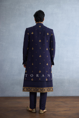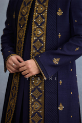 The Behare Kashim Sherwani is a one-of-a-kind addition to your wardorbe, made with a luxurious navy blue Jeni silk fabric. It is further enhancedd with the exquisite combination of traditional doria and dabka work, to add richness and luxury to any outfit.