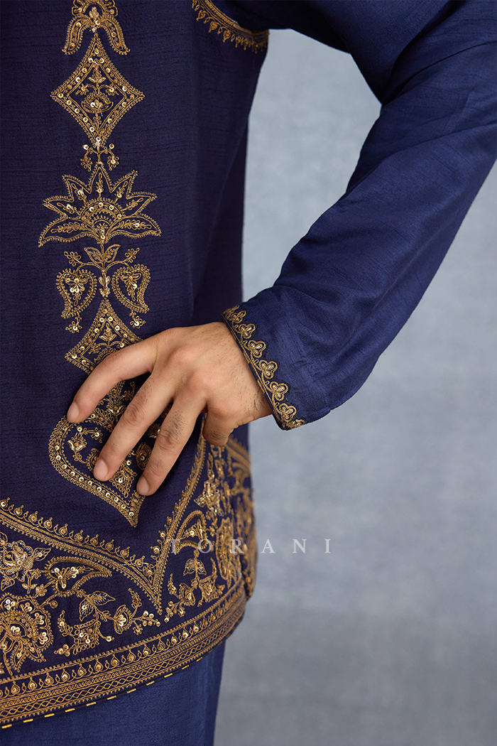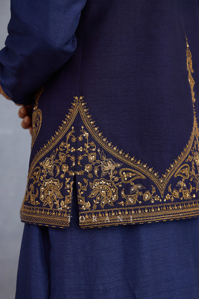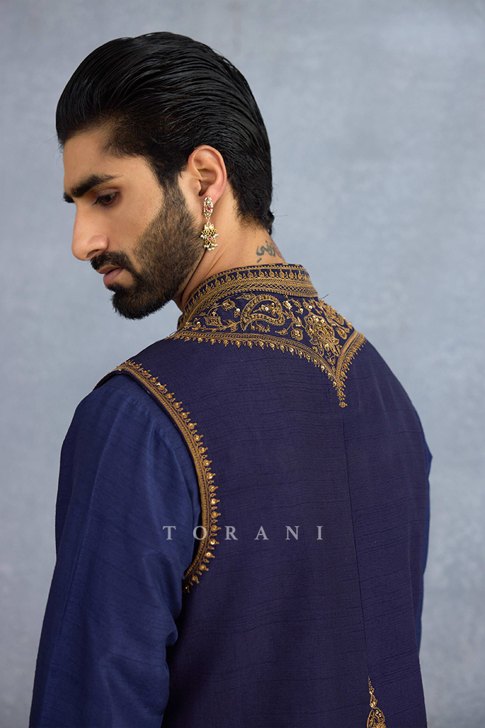 The Behare Madan Bandi features intricate intricate doria embroidery, crafted from a premium Jeni silk in a classic navy blue color. The Bandi is a perfect addition to any casual or formal wear, elevating the look with its meticulous and fine craftsmanship.