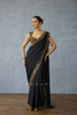 The Bhadra Aparna Saree is designed to offer a bold look on your momentous occasions. The saree is crafted with a black jeni silk fabric, with intricately zari-embroidered borders. The combination of golden and black gives an ethereal touch to this saree. Wear this to any occasion and turn heads your way.