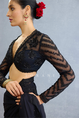 The Bhadra Chitrini Blouse is crafted with butterfly net and embroidered with black cutdana, dabka and dori work in detail for an enchanting look. Wear it as a choli, or with a saree- the elegance of this blouse is unmatched in every way.