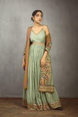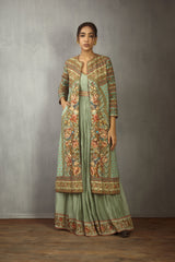 The Champa Dhuni Jacket is a beautiful, handcrafted saree made from a blend of Jacquard fabric and Cotton Silk, adorned with intricate Hand embroidery and Digital print. The elegant green color makes it perfect for any special occasion.