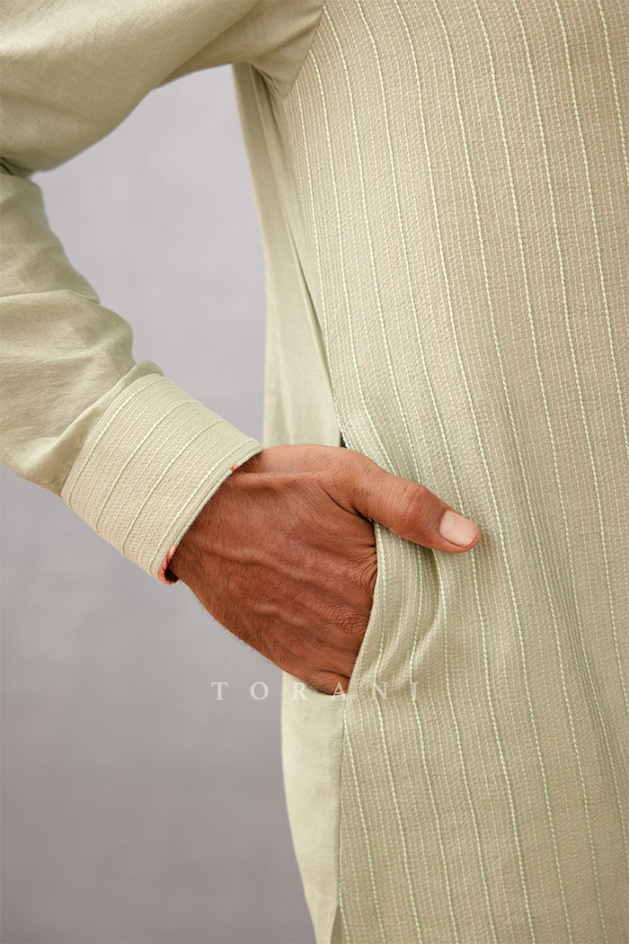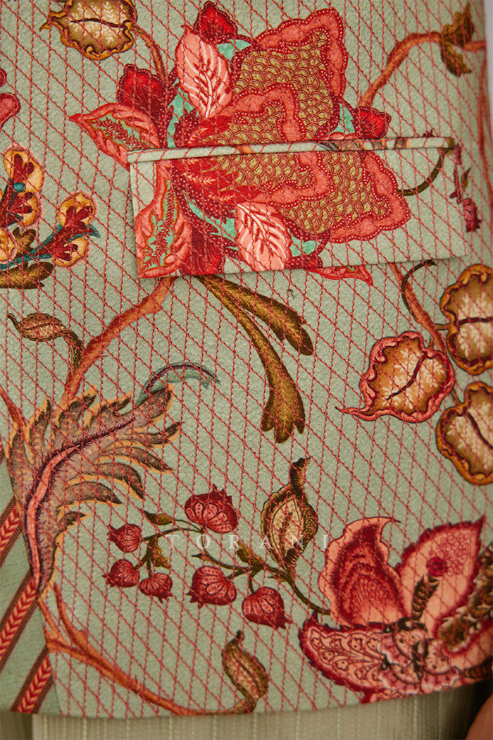 Upgrade your wardrobe with the Champa Faiz Bandi Set. This stylish set comprises of a quilted bandi in Pista Green Cotton Silk and a Handwoven Chanderi Kurta and Plain Pants in green. The digital print and quilting add a touch of sophistication to this timeless piece. Perfect for special occasions.