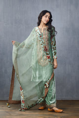 This Champa Makhmal Firdouz Kurta Set is made from a luxurious blend of Silk Velvet, Cotton Silk, and Cotton Voile fabric. It features beautiful Digital Print, Mirror Work, and Hand Adda Work designs in a vibrant Green color. Perfect for any special occasion, this kurta set will ensure you look and feel your best.