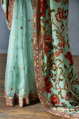 This Champa Makhmal Pallu Sheesha Revathi Saree is a stunning mix of silk velvet and organza fabrics, delicately hand-embroidered for a unique touch of luxury. The green colour adds an eye-catching vibrancy that makes it an ideal showstopper for special occasions.
