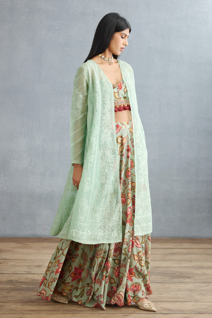 The Champa Paavni Cape is a classic traditional attire crafted from high-quality Silk Organza fabric and Aari embroidery. The eye-catching green color will make a statement in any room. Be sure to add this beautiful and traditional piece to your wardrobe.