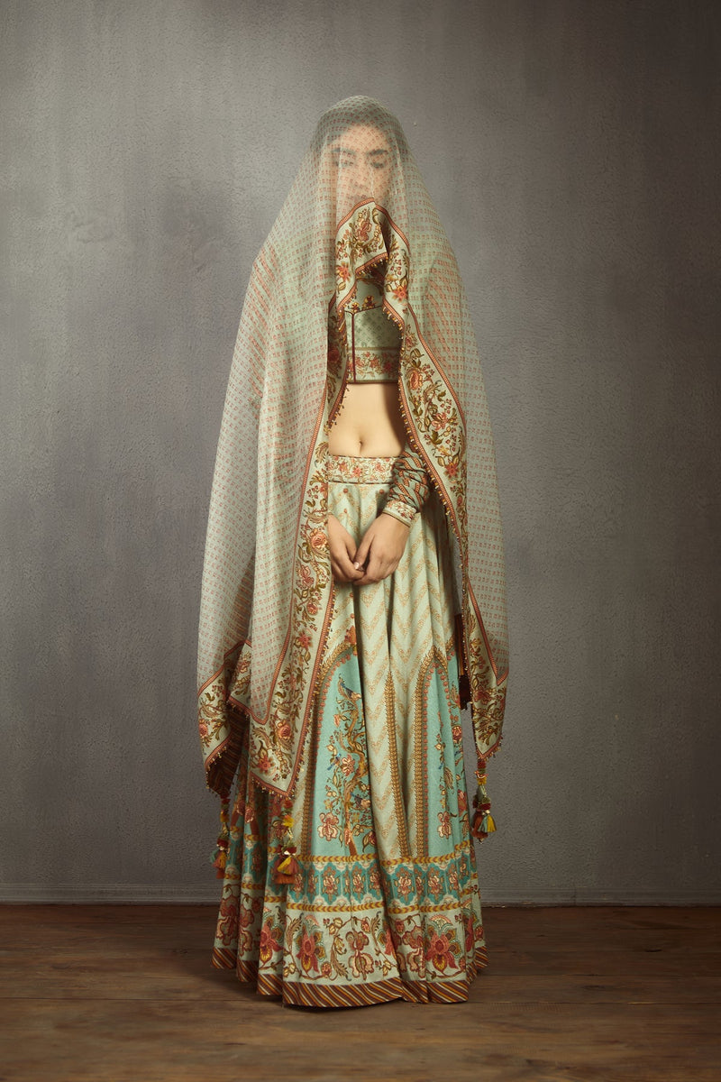 This Champa Sibani Odhni is a combination of traditional Block printing and Digital printing on Silk Organza and Handwoven Chanderi fabric. Its green tones offer high quality color clarity and vibrancy. Enjoy the feel of this luxurious and durable fabric.