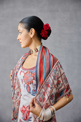 This Coromandel Anura Scarf is crafted with a lightweight silk crepe organza fabric, accented with digitally printed chintz florals and stripes. The monochrome look of the scarf makes it a unique find for summers.