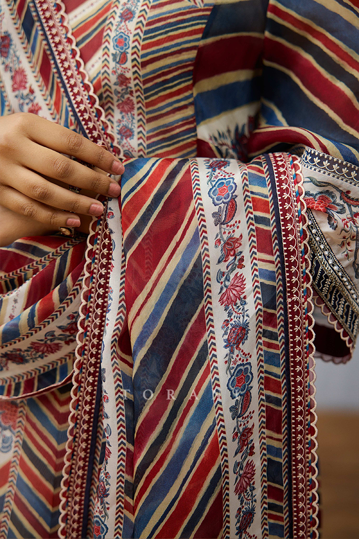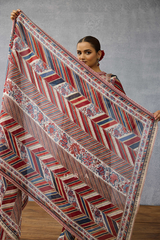 The Coromandel Asthika Odhni is crafted with a lightweight silk crepe organza fabric, designed with digital, multicolor chevron print and floral details. The odhni is a fine addition to your wardrobe this summer.