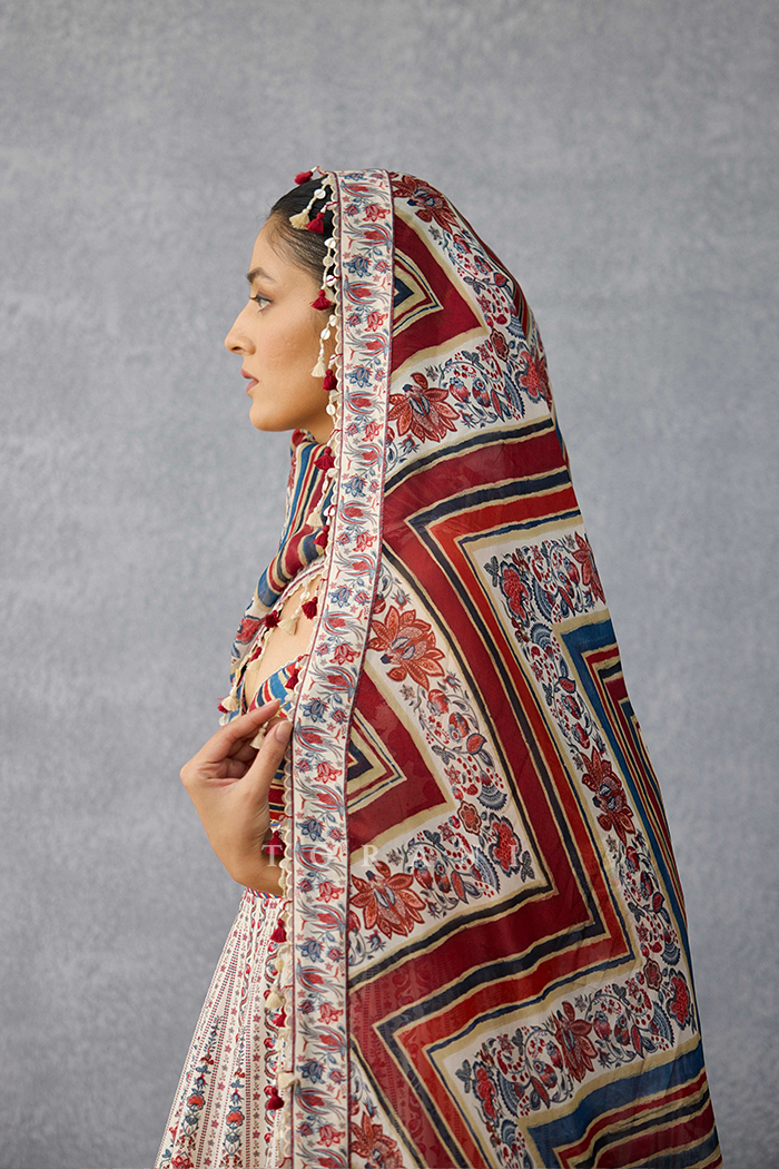 The Coromandel Sarika Odhni is the perfect addition to your Summer wardrobe. With its eye-catching monochrome digital print on a delicate silk crepe organza fabric, odhni is highlighted with hand motifs, sequin and tassel work.
