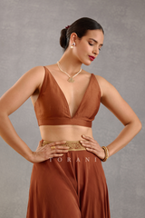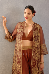 The Dahlia Paavni Blouse from the Gudiya Rani collection is crafted with luxury materials such as silk crepe, handwoven chanderi, cotton silk, and silk organza. The blouse features intricate aari embroidery and hand block print. Comes in a luxurious brown hue.
