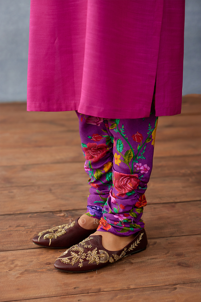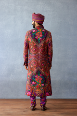 The Dil Kusha Riyaz Sherwani Set is a statement piece that exudes regality. Featuring gorgeous maximalist prints all over purple, this set includes a sherwani, kurta and a churidaar crafted with luxurious jeni silk, muslin silk and slub silk fabrics. The spectacular purple hue of this sherwani set is truly a unique approach to traditional menswear.