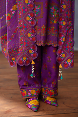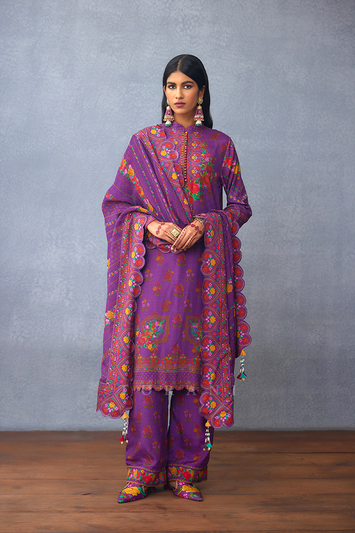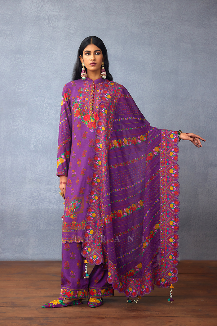 Adorned with intricate floral prints and a printed border, the Dil Kusha Zainab Odhni is crafted in a beautiful purple hue. The odhni features beautiful heart shapes and scalloped details around the border, making it a must-have for your closet.