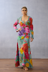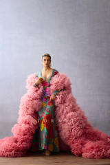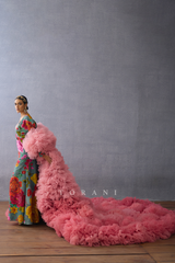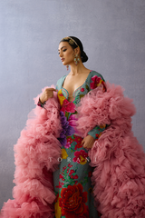 The Dil Nawaz Kiara Dress Set is sure to turn heads at any occasion. The dress features floral prints in vibrant colors, set against a stunning blue hue, curated for special occasions that call for grace and poise. The set is completed by a stylish braalette and a graceful pink cape with frills and tassels.