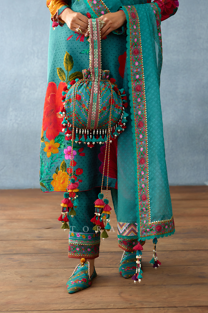Sure to make you stand out, the Dil Nawaz Refa Potli is a feast to the eyes of the beholder. Crafted in the long-lasting Silk Slub, the authentic prints and the playful tassel fringes would make it a prized accessory that always adds to your festive outfits.