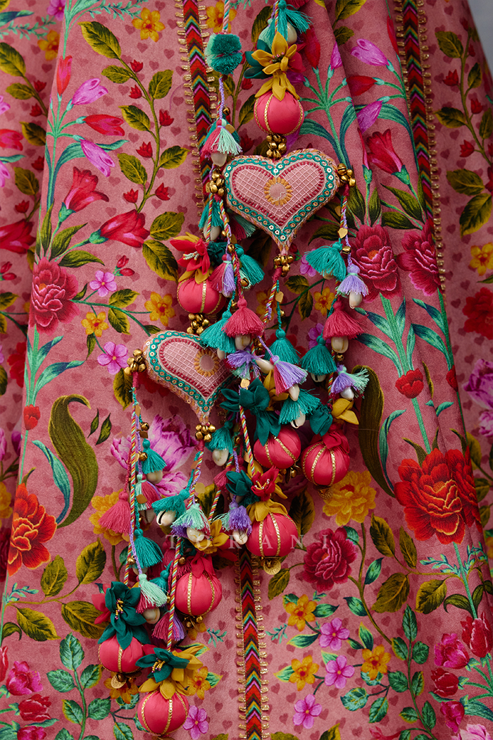The Dil Ruba Arasi Lehenga Set is an elegant ensemble to grace your significant events. Crafted using raw silk, this set features a lehenga, blouse and an odhni- all in a grogeous shade of blush pink with an embroidered border and colourful digital prints.
