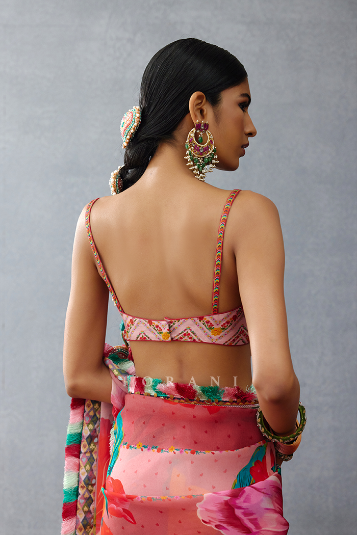 The heart-shaped Dil Ruba Nalini Bralette is a contemporary addition to any wardrobe. Crafted in Jeni Silk and decorated with colourful tassels, this blush pink bralette brings an elegant, feminine look with the saree. It surely adds an India Modern touch to your closet