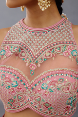 The Dil Ruba Safiyya Blouse is a stylish addition to any wardrobe. Crafted in Butterfly Net and decorated with intricate embroidery, this blush pink blouse brings an elegant, feminine touch to the saree.
