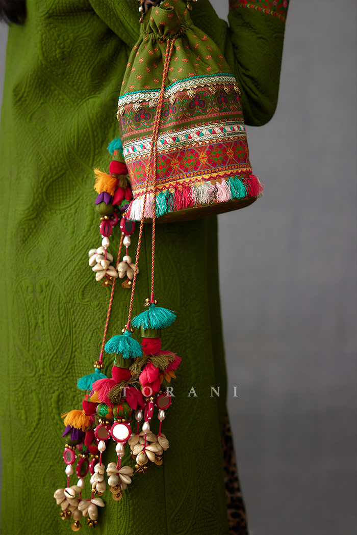Sure to make you stand out, the Dil Saaz Uzwa Potli is a feast to the eyes of the beholder. Crafted in long-lasting Slub Silk, the authentic prints and the gorgeous handmade tassles of this bag makes it a prized accessory that always adds to your festive outfits.