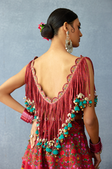 The Dil Surkh Afri Blouse is a stylish addition to any wardrobe. Crafted in jeni silk and decorated with tassels, the deep red blouse brings a feminine touch to the lehenga set.