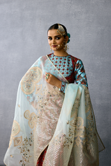 Crafted in Organza, the Neer-Kashish Vimalangi Odhni is embellished with Zari work and Sequin work - a timeless piece in the softest blue shade.