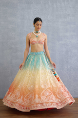 The gorgeous Godhuli Meera Lehenga Set is crafted with a comfortable combination of organza and jeni silk fabric. It features intricate embroidered details with tropical flora motifs. The ombre shade of this lehenga offers an unique appeal.