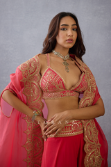 This Gul-Kand Nayantara Bralette is a perfect combination of contemporary and classic style. Its fabric is crafted from a premium mix of raw silk, and pure silk crepe, with hand embroidery, dori embroidery, and hand adda work. The set is available in a gorgeous pink color, making it a timeless statement piece.