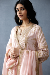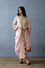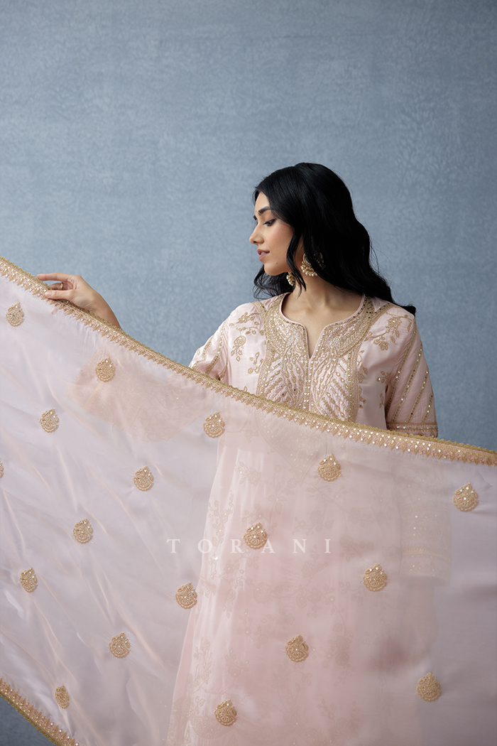 The Gul-Naar Mandira Odhni is crafted in pure Silk Organza, for the perfect blend of elegance and luxury. Decorated with an intricately embroidered border of Zari and a temple-scallop design, it's sure to be a statement piece in your festive outfit.