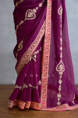 The Shafaq Aanam Saree is crafted from georgette fabric with a Jeni silk border. It is intricately embroidered with dori work, traditional dabka and badla work in rose gold and gold threads, along with pearl details. With its distinct shade and exquisite craftsmanship, this saree is a gorgeous addition to your festive wardrobe.