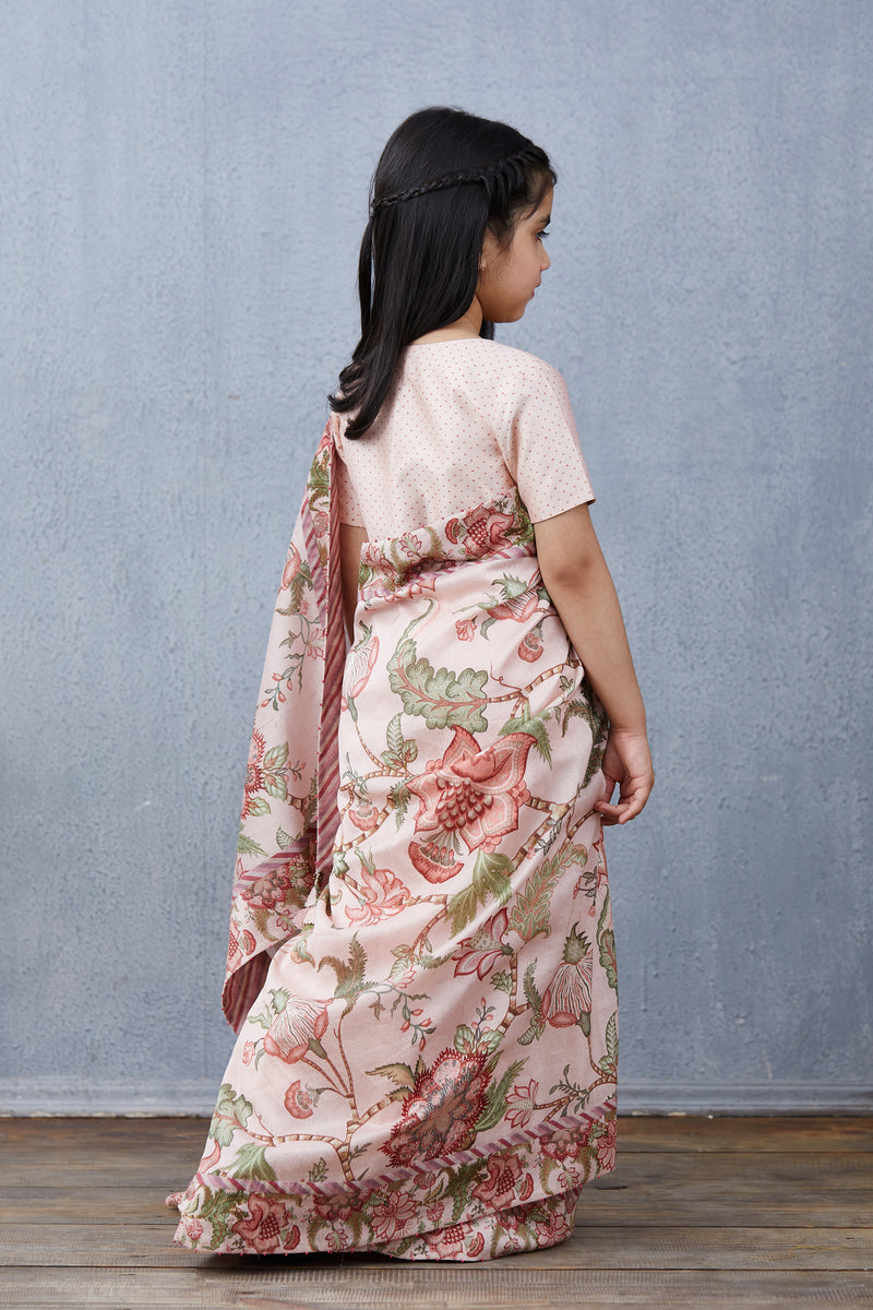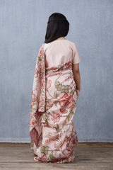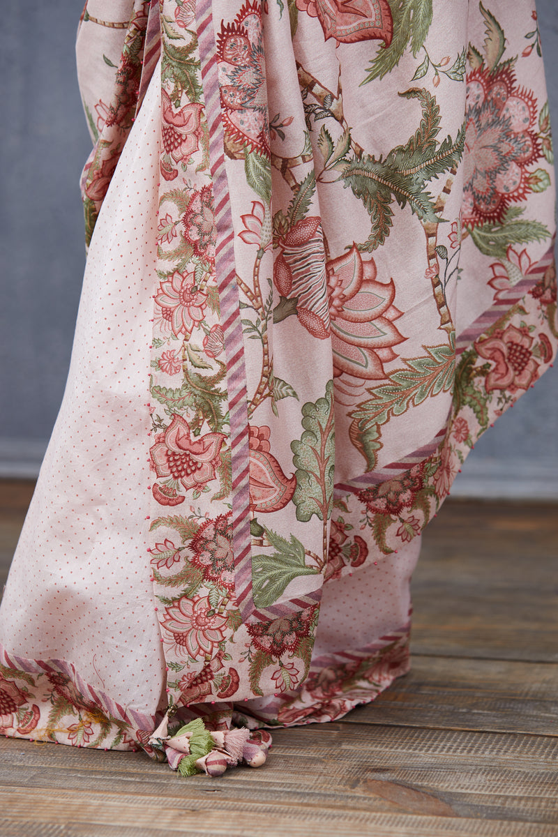 This Gulbahari Chandani Saree Set has been handwoven with luxurious chanderi fabric. It features a beautiful fusion of digital prints and traditional hand block printing in a delicate pink hue. Experience fine craftsmanship and exceptional elegance in this saree set.