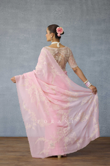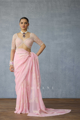 The exquisitely designed Gulaban Pankhuri Saree is crafted with a lightweight georgette fabric, and is intricately decorated with hand and dori embroidery. The blush pink shade of this saree makes it a staple for your summer fiestas and more.