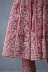 The Gulbaag Kalidaar Paavni Kurta Set brings together exquisite textures and craftsmanship. The set includes a bright pink kurta, salwar, and odhni made of luxurious materials like silk organza, cotton-silk, and handwoven Chanderi, all detailed with intricate aari embroidery. Make a statement in this sophisticated three-piece set.